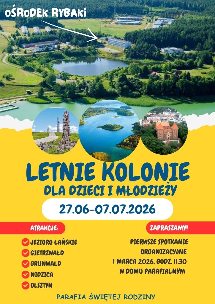 Nasza parafia organizuje letnie kolonie dla dzieci i młodzieży w Rybakach nad Jez. Łańskim od 27 czerwca do 7 lipca 2026 r. Pierwsze spotkanie organizacyjne będzie w niedzielę, 1 marca o 11.30 w domu parafialnym. Zapraszamy!